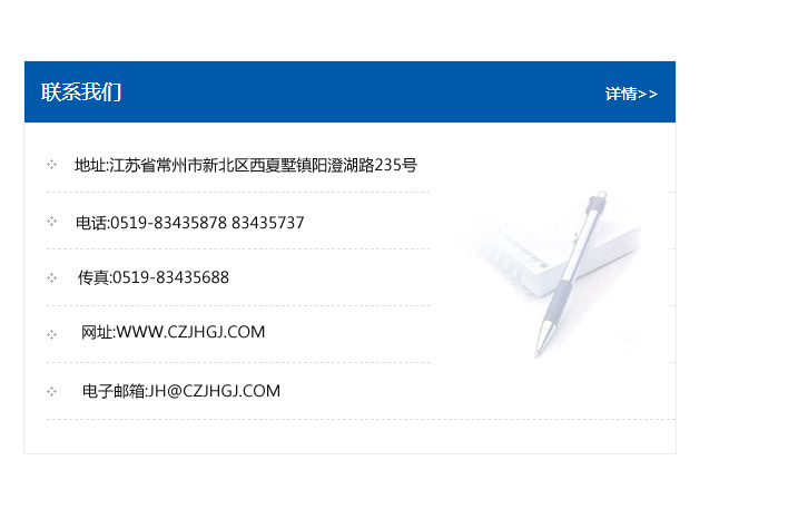 地址:常州市新北區友邦商務大廈1幢16、17層  電話:0519-85101652  傳真:0519-85112595  郵編:213022  網址:www_cz-jiayue_cn.xczhijie.com  郵箱:xiajifengaa@163.com